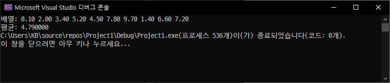 # 배열 원소를 가리키는 포인터를 이용해서 실수형 배열의 평균을 구하는 프로그램을 작성하시오. 실수형 배열은 크기가 10이고 마음대로 초기화해서 사용해도 된다.