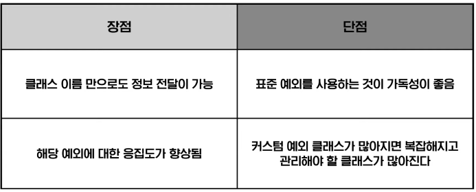 하지만 커스텀 예외 클래스가 많아지면 복잡해지고 그만큼 관리하기 어렵다는 단점이 있다.