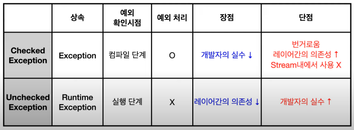 반대로 `RunTime Exception`을 상속받는 Unchecked Exception은 컴파일 시점에 예외 처리를 확인하지 않는다.