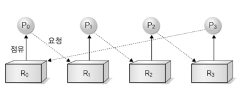 자원을 사용하기 위해 대기하는 프로세스들이 원형을 이룬 채 대기하고 있기 때문이다.
