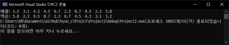 # 실수형 배열에 대해서 원소들을 역순으로 만드는 reverse_array 함수를 작성하시오.크기가 10인 double 배열에 대해서 원하는 값으로 초기값을 채운 다음 reverse_array 함수의 호출 결과를 확인하는 프로그램을 작성하시오.