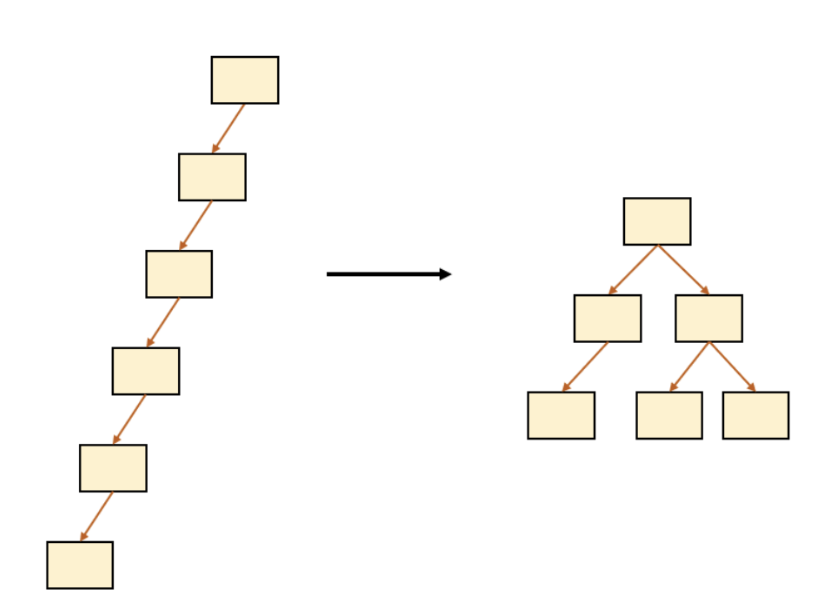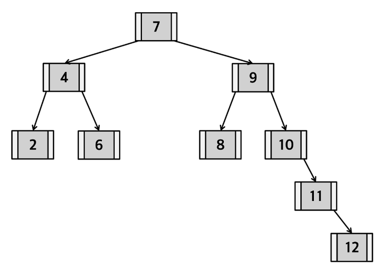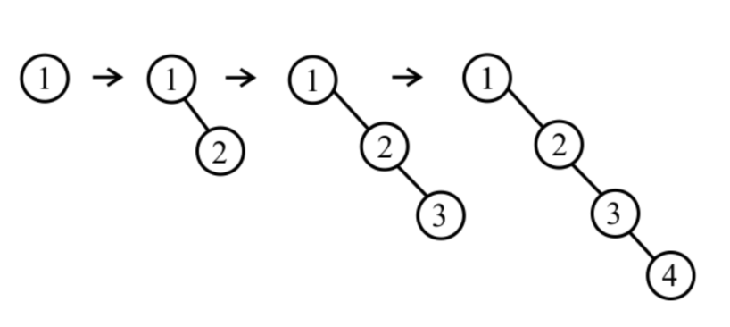 이렇게 이진 탐색트리가 한쪽으로 치우쳐진 skewed binary search tree(편향 이진 탐색 트리)가 되면 최악의 경우 O(n)의 시간복잡도를 가지게 된다.