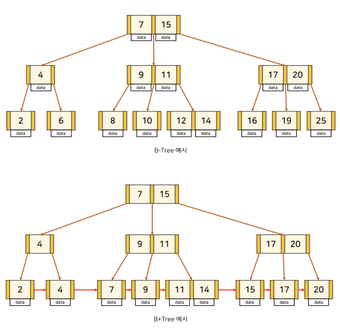 - B+Tree: 데이터는 리프 노드에만 존재하므로, 범위 쿼리는 리프 노드를 시작으로 연결된 리스트를 따라가면 모든 데이터를 조회할 수 있다.