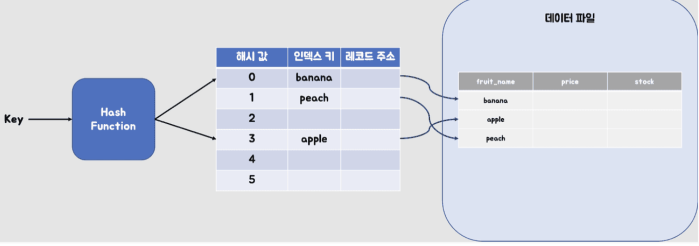 특정 컬럼에 대해 Hash 인덱스를 설정할 경우, 해당 컬럼의 값에 해시 함수를 적용하여 해쉬 값을 얻고, 이 해쉬 값의 위치에 컬럼 원본 값과 레코드 주소가 저장된다.