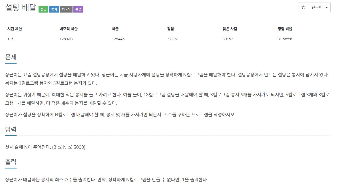 문제 상근이는 요즘 설탕공장에서 설탕을 배달하고 있다. 상근이는 지금 사탕가게에 설탕을 정확하게 N킬로그램을 배달해야 한다. 설탕공장에서 만드는 설탕은 봉지에 담겨져 있다. 봉지는 3킬�