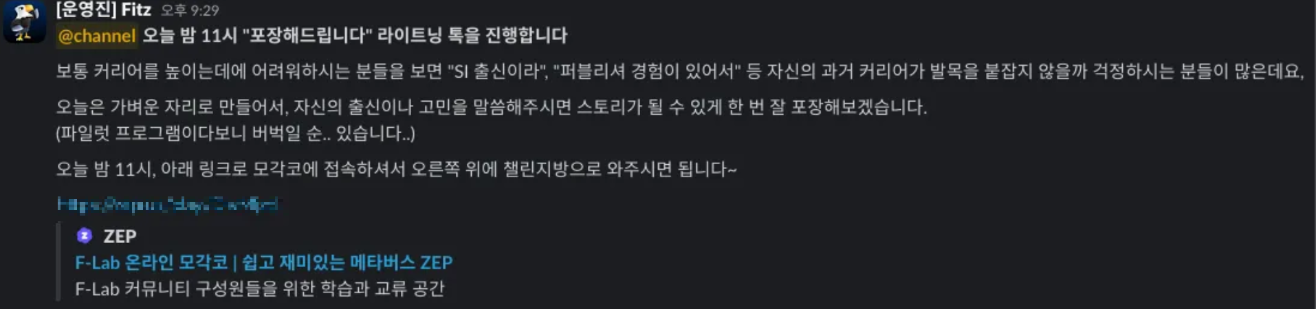 특히 Fitz님이 여시는 라이트닝 톡이 뭔가 참여율도 좋고 멘티분들도 잘 참여해 주셔서 제일 유익한 것 같다! 맨날 해주세요