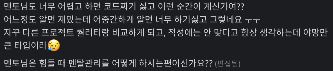 한 번씩 진짜 안되는 거 오래 붙잡고 있으면 한숨 퍽퍽 쉬면서 "멘토님이 해줬음 좋겠다.." 이런 생각도 함^^