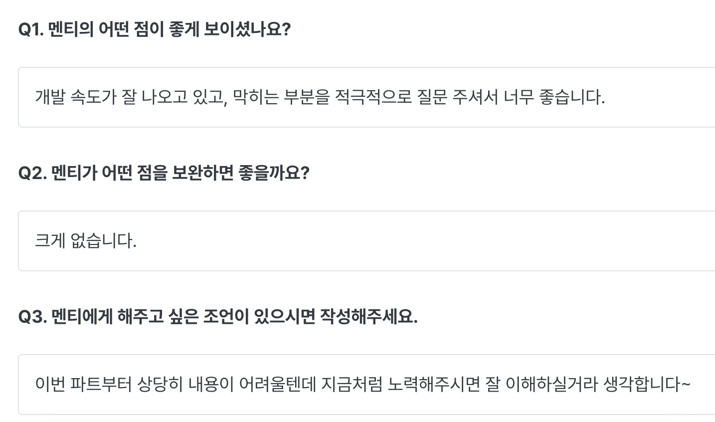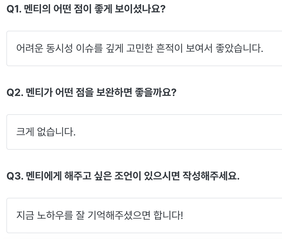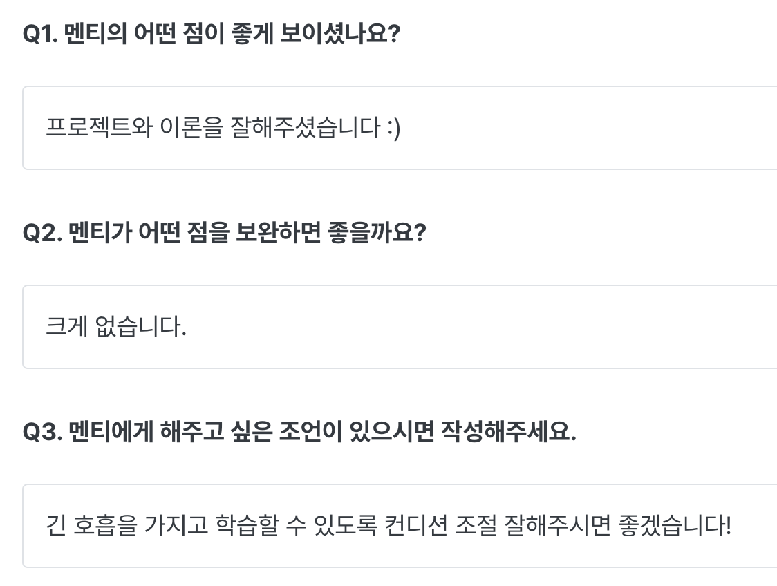 나는 그날 멘토링에 대한 피드백을 적고, 멘토님은 나에 대한 피드백을 남겨주신다.