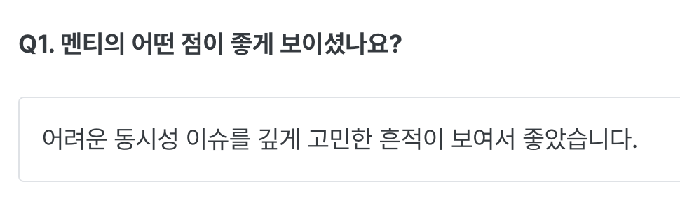 멘토님한테 계속 질척거린 덕분인지 이번 주 멘토링 피드백에서 이렇게 작성해 주셨다.