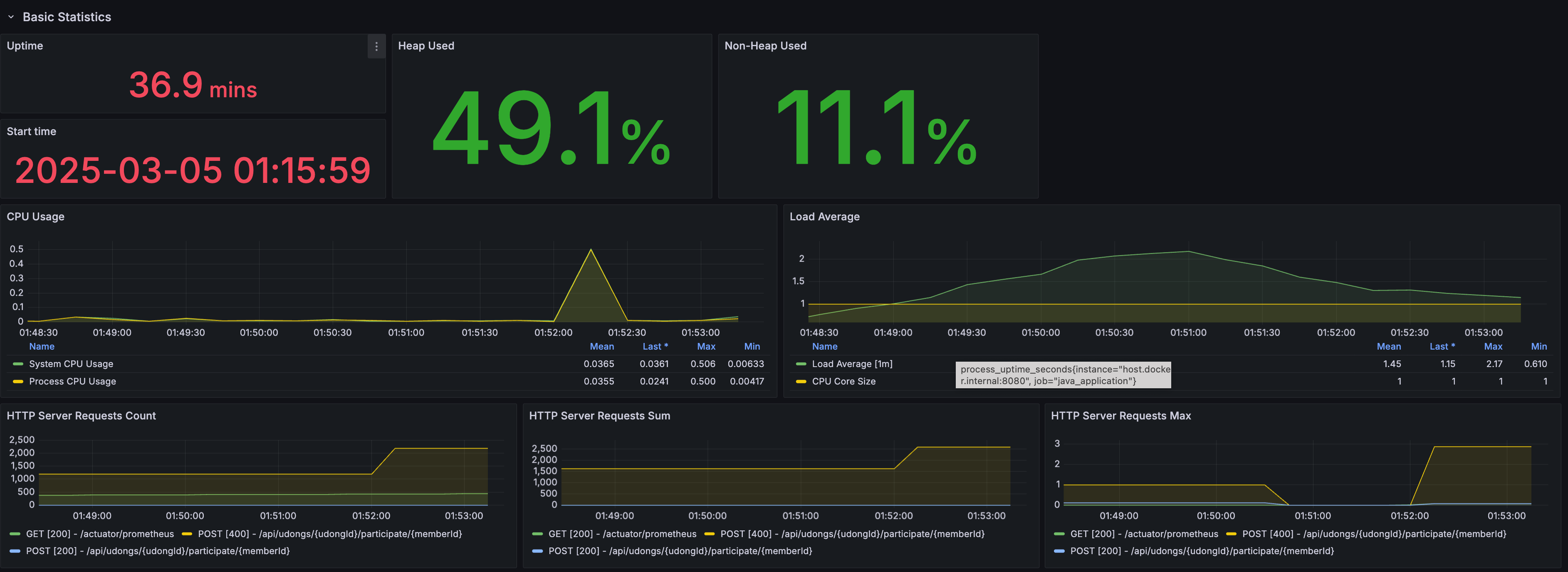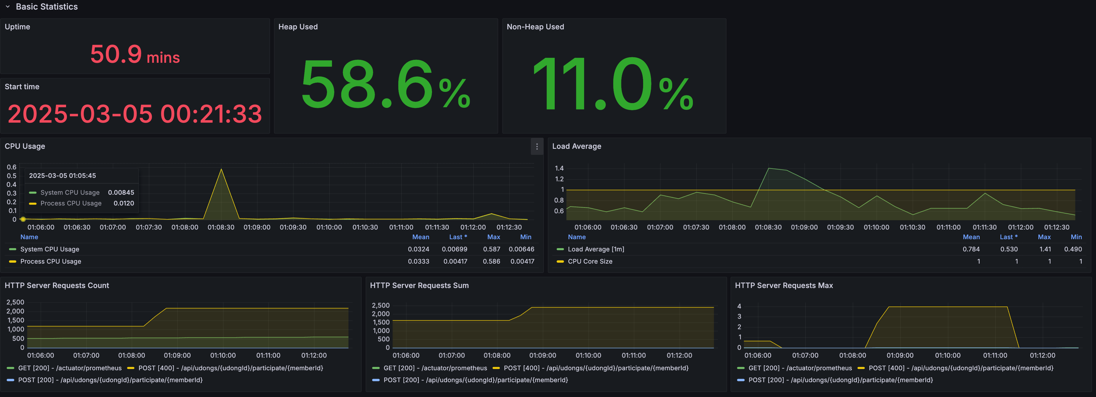 많은 충돌일 때는 1000명이 동시 참여 요청을 보내면, 같은 우동 엔티티에 대해 1000개 트랜잭션이 한 번에 몰린다. DB는 하나의 트랜잭션만 락을 획득하고, 나머지 999개는 바로 락 대기 상태로 진입한다. 이때 DB 커넥션 풀이 빠르게 소진되고, 일부 요청은 즉시 타임아웃되면서 최단 응답 시간이 짧아진 게 아닐까?라고 추측해 보았다. 🤔