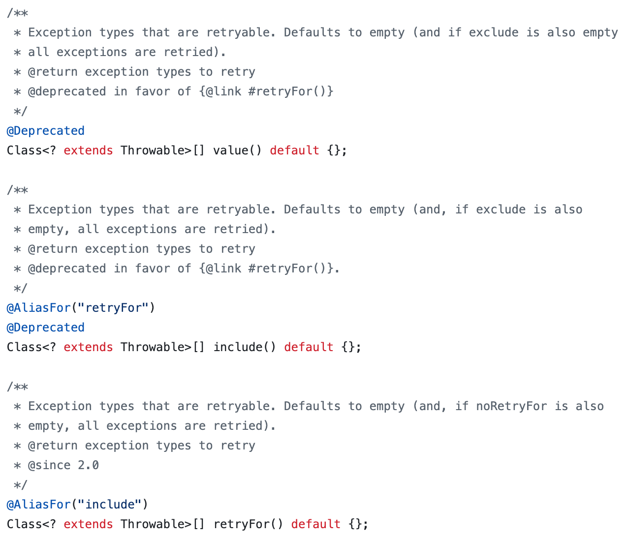 2. @Retryable를 사용한 많은 예제에서 Exception types을 지정하는 부분에 value를 많이 작성하는 걸 보았는데, 스프링 프로젝트의 spring-retry 코드를 보니 이는 Deprecated처리되었고, retryFor로 대체되었다고 한다.