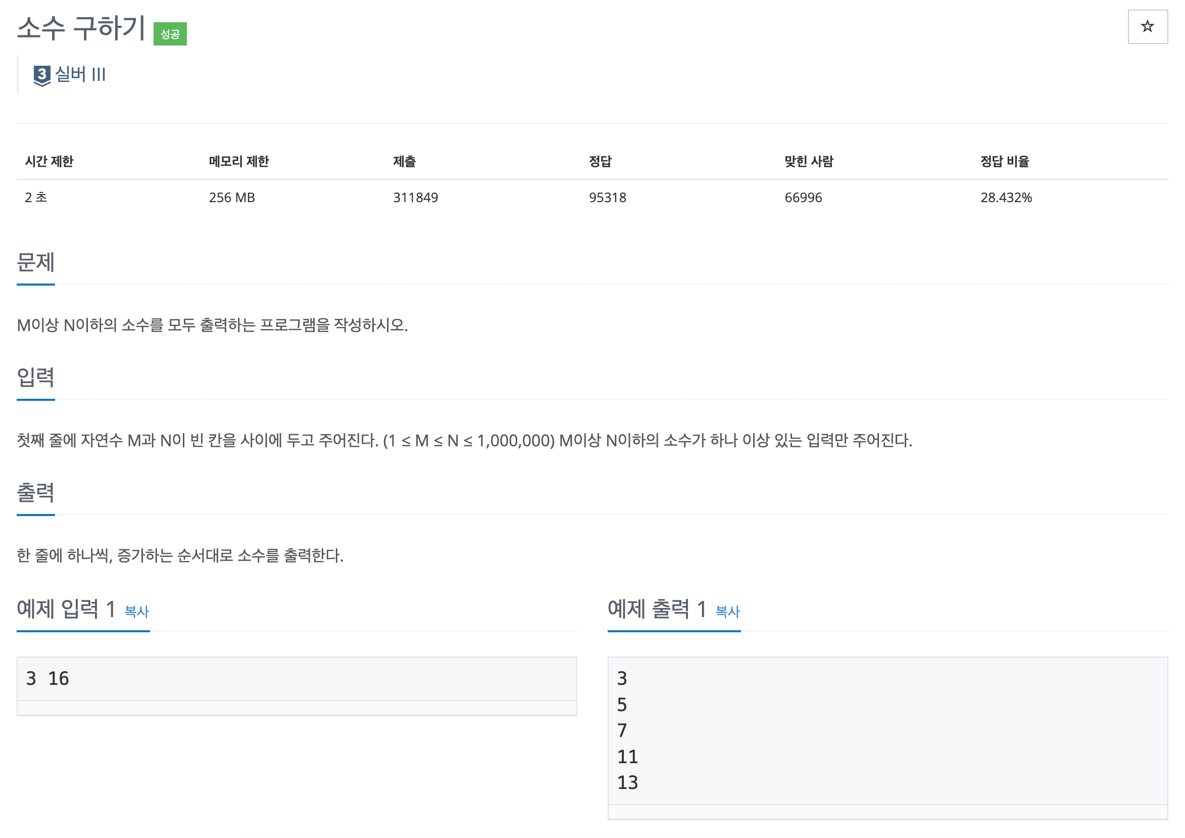 처음에는 M부터 N까지 하나하나 소수인지 검사하려고 했는데, 범위가 최대 1,000,000이라서 시간 초과가 날 것 같았다.