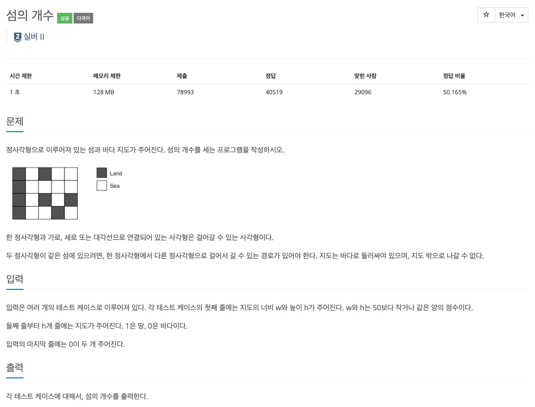지도 전체를 돌면서 아직 방문하지 않은 땅(1)을 발견하면 DFS를 시작하고, 연결된 모든 땅을 방문 처리한 뒤 섬의 개수를 증가시키는 방식으로 구현했다.