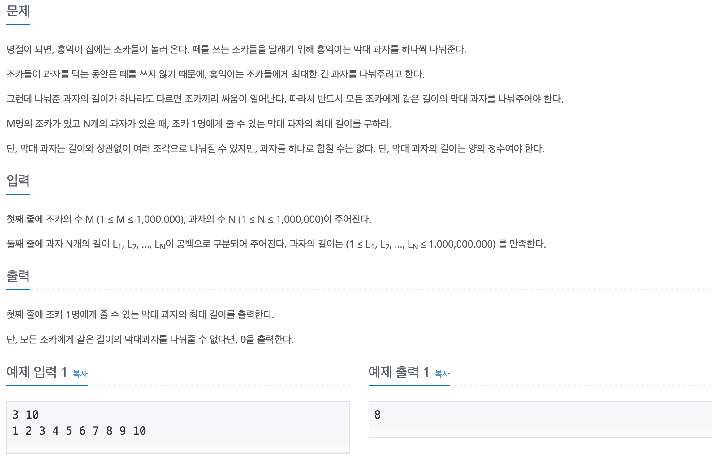 count += len / mid; // mid 길이로 나눌 수 있는 조각 수