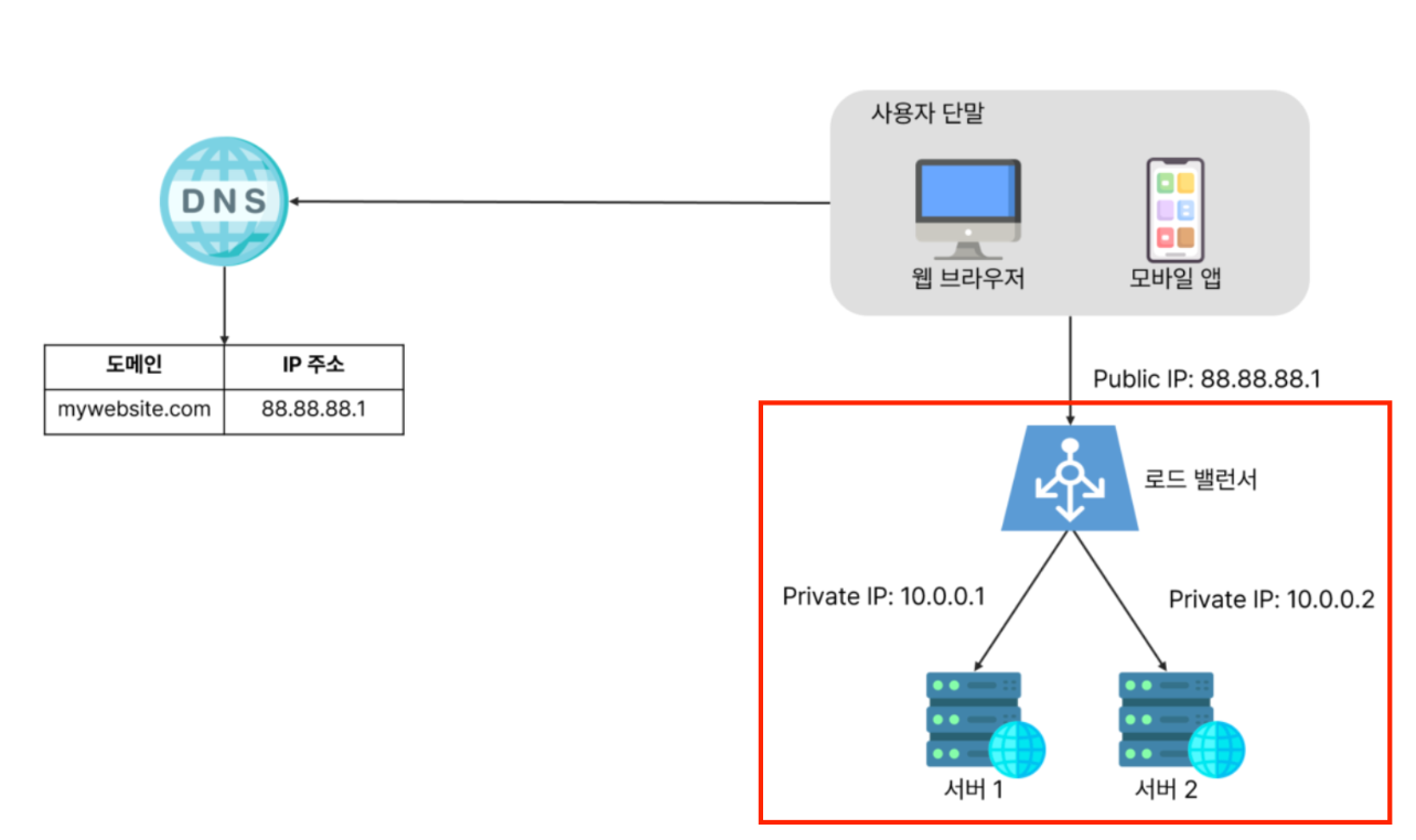위 그림을 보면 사용자는 로드밸런서의 공개 IP 주소(public IP address)로 접속한다.
