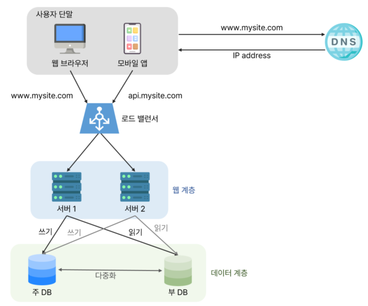 따라서 웹/모바일 트래픽 처리 서버(웹 계층)와 데이터베이스 서버(데이터 계층)를 분리하여 독립적으로 확장할 수 있게 한다.
