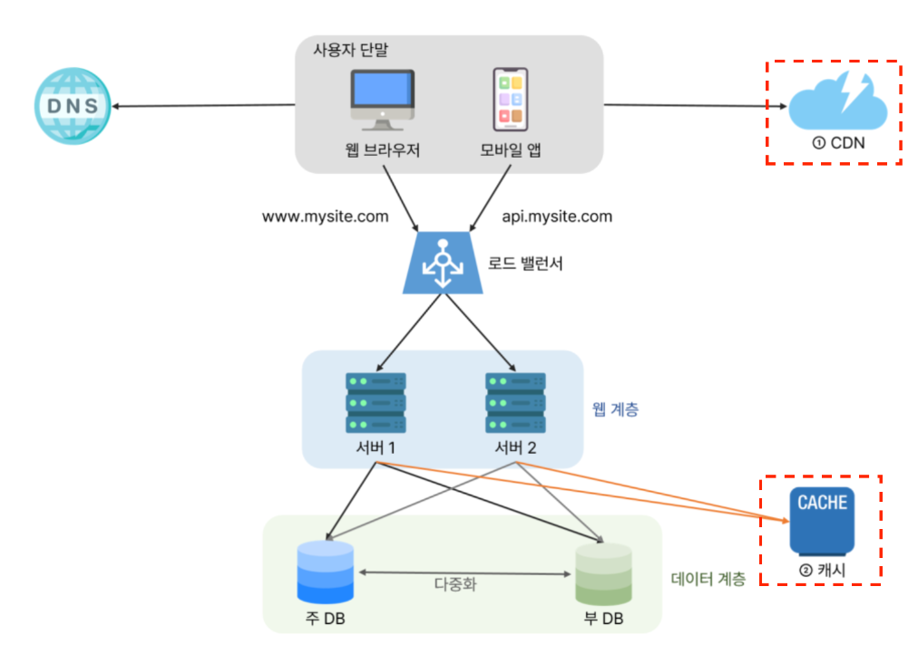 응답 시간은 캐시(cache)를 붙이고 정적 컨텐츠를 콘텐츠 전송 네트워크(CDN)로 옮기면 개선할 수 있다.