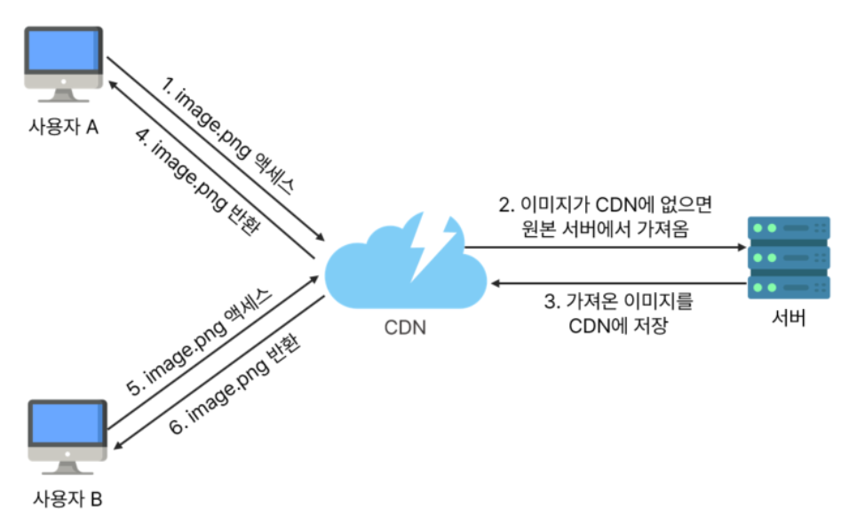 | CDN | 정적 콘텐츠(JS, CSS, 이미지 등)를 캐싱하고 빠르게 전송 |