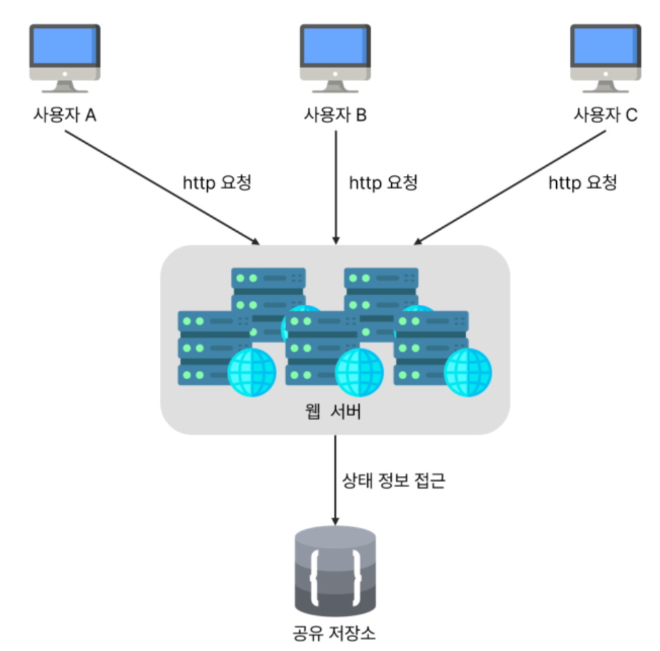 대신 세션 데이터 같은 상태 정보는 별도의 공유 저장소(shared storage)에 두고, 필요할 때마다 꺼내온다.