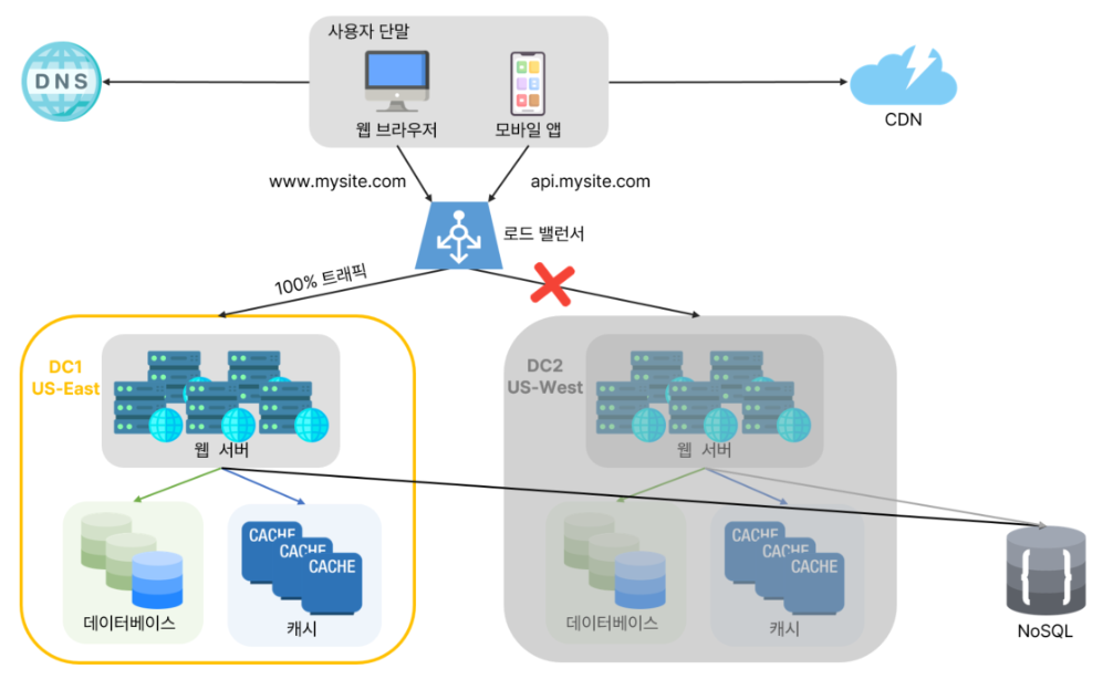 만약 US-West 센터에 심각한 장애가 발생하면, geoDNS는 모든 트래픽을 US-East로 우회시킨다.