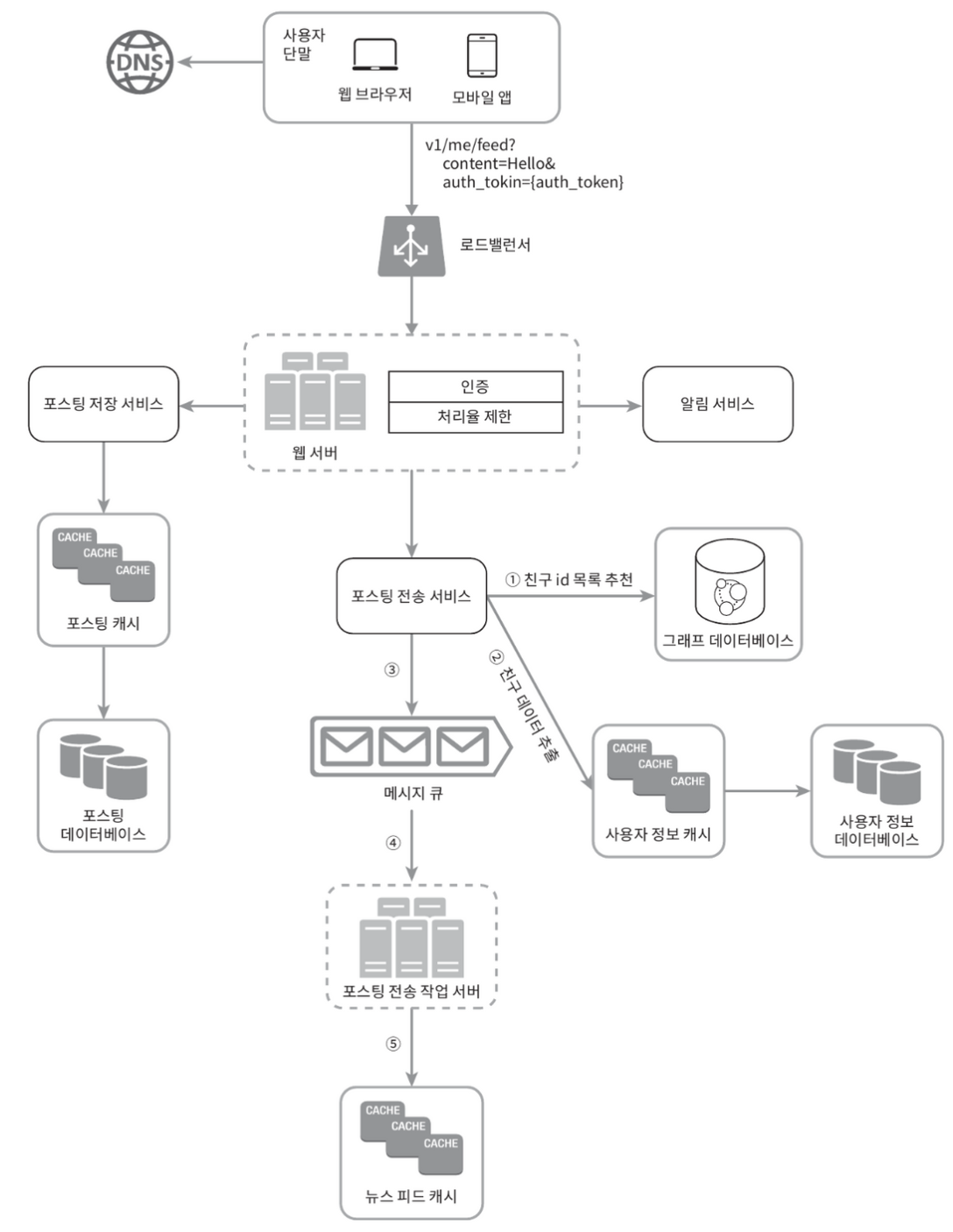 사용자가 포스트를 올리면 관련된 데이터가 캐시/DB에 기록되고, 해당 사용자의 친구 뉴스 피드에 뜨게 된다. - 피드 생성