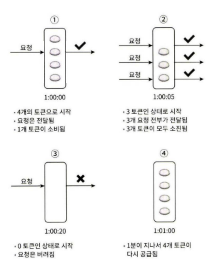 다음 그림은 토큰을 어떻게 버킷에서 꺼내고, 토큰 공급기는 어떻게 동작하며, 처리 제한 로직은 어떻게 작동하는지를 보여준다.