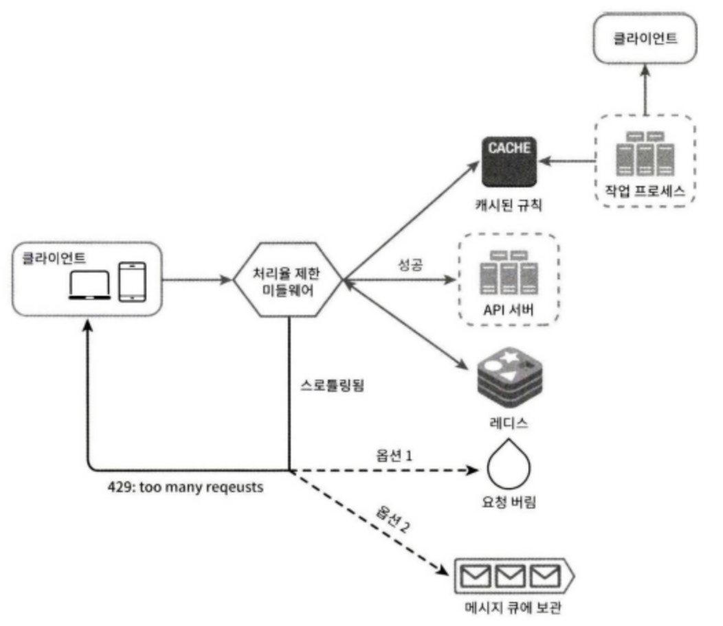 - 해당 요청이 처리율 제한에 걸렸다면 429 에러를 클라이언트에 보낸다. 한편 해당 요청은 그대로 버릴 수도 있고 메시지 큐에 보관할 수도 있다.
