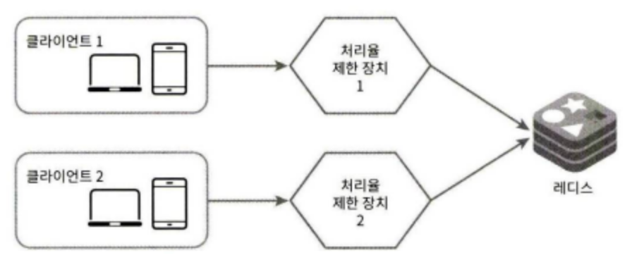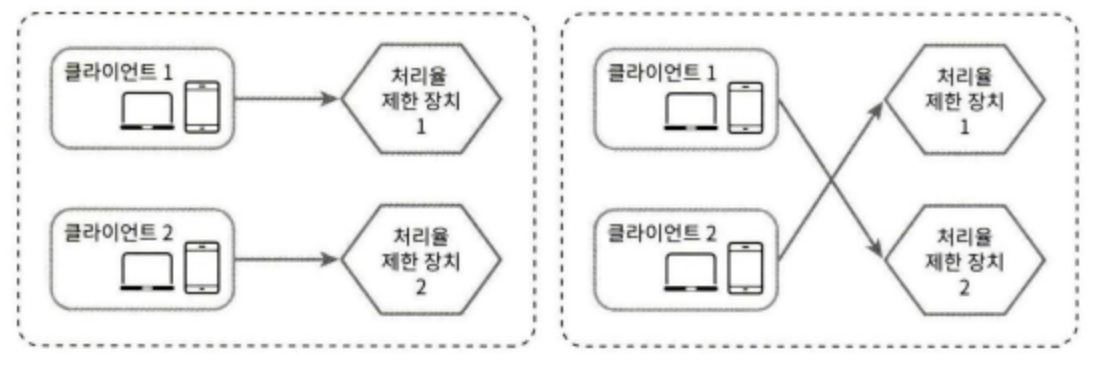 왼쪽그림의 경우 클라이언트 1은 제한 장치 1에 요청을 보내고 클라이언트 2는 제한 장치 2에 요청을 보내고 있다.