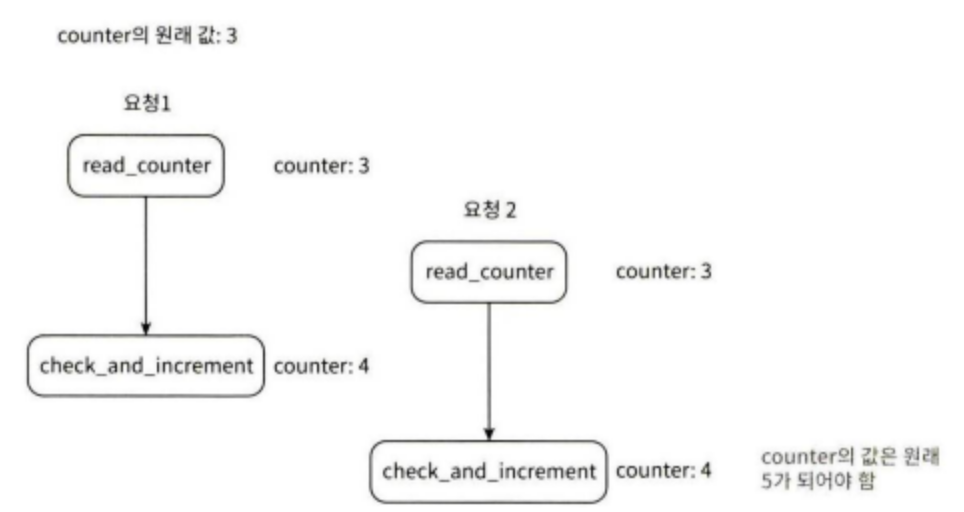 그리고 두 개 요청을 처리하는 스레드가 각각 병렬로 counter 값을 읽었으며 그 둘 가운데 어느 쪽도 아직 변경된 값을 저장하지는 않은 상태라 해 보자.