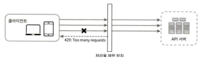 - 대형 IT 기업들이 공개한 대부분의 API는 어떤 형태로든 처리율 제한 장치를 갖고 있다. 예를 들어 트위터는 3시간 동안 300개의 트윗만 올릴 수 있도록 제한하고 있다.