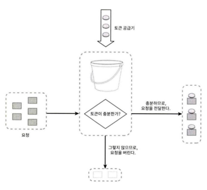 - 토큰 버킷은 지정된 용량을 갖는 컨테이너다. 이 버킷에는 사전 설정된 양의 토큰이 주기적으로 채워진다. 토큰이 꽉 찬 버킷에는 더 이상의 토큰은 추가되지 않는다.