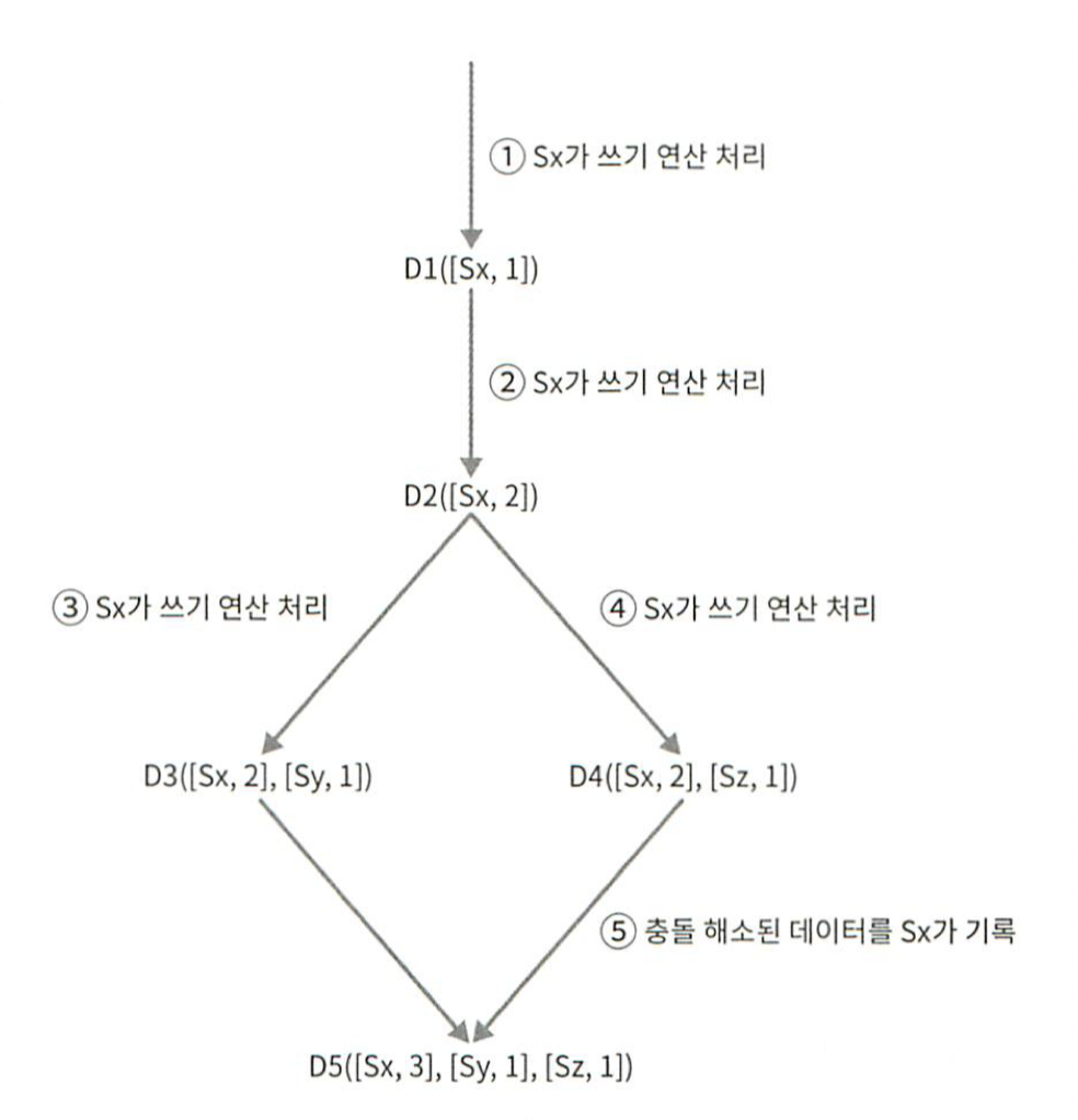 - 어떤 클라이언트가 D3과 D4를 읽으면 데이터 간 충돌이 있다는 것을 알게 된다. D2를 Sy와 Sz가 각기 다른 값으로 바꾸었기 때문이다. 이 충돌은 클라이언트가 해소한 후에 서버에 기록한다. 이 쓰기 연산을 처리한 서버는 Sx였다고 하자. 벡터 시계는 `D5([Sx, 3], [Sy, 1], [Sz, 1])`로 바뀐다. 충돌이 일어났다는 것을 어떻게 감지하는지는 잠시 후에 더 자세히 살펴볼 것이다.