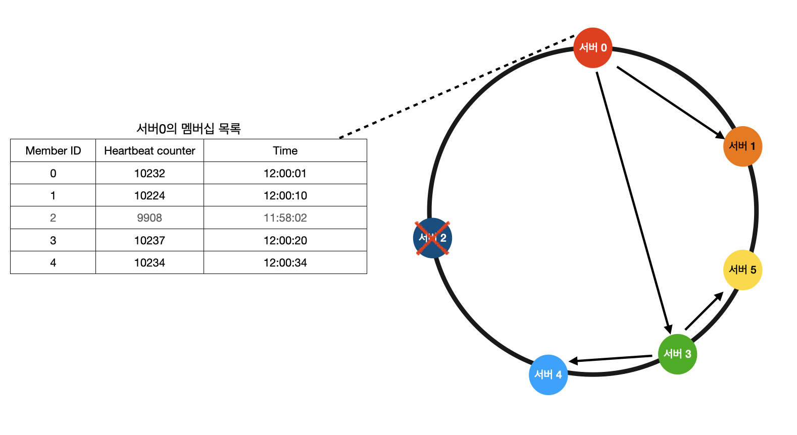 - 어떤 멤버의 박동 카운터 값이 지정된 시간 동안 갱신되지 않으면 해당 멤버는 장애 상태인 것으로 간주한다.