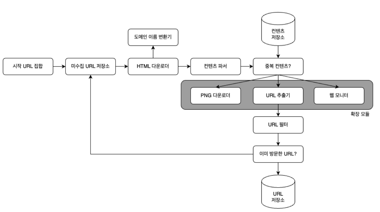 | 안정성 | 비정상적 입력(잘못된 HTML, 장애 서버, 악성코드 등)에도 견딜 수 있어야 한다. |