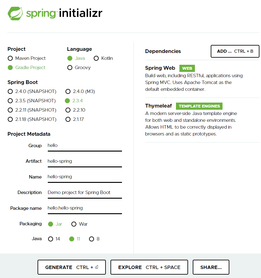 - Spring Web, thymeleaf(html 템플릿 엔진) 라이브러리를 추가해주고