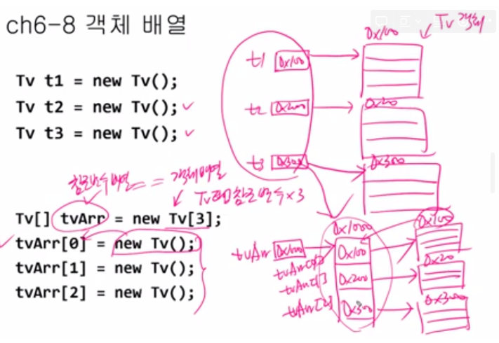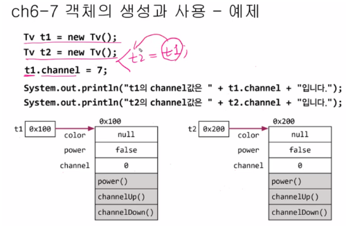 t = new Tv(); //Tv인스턴스를 생성한 후, 생성된 Tv인스턴스의 주소를 t에 저장