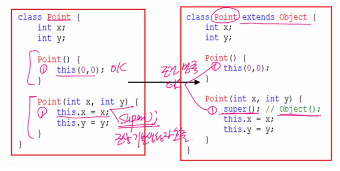 - 그렇지 않으면 컴파일러가 생성자의 첫 줄에 super();를 삽입한다.