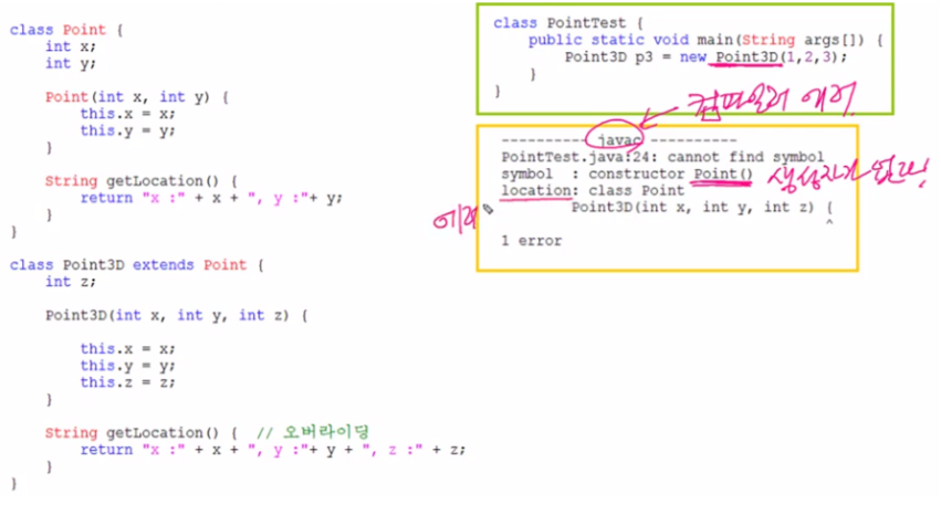 → Point3D의 생성자에서 `super(x, y);`를 호출했다면 에러가 나지 않았을 것.
