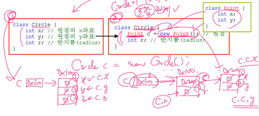 class Circle { Point c = new Point(); //원점 int r; //반지름 }