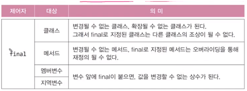하나의 대상에 여러 제어자를 같이 사용 가능하다.(접근 제어자는 하나만)